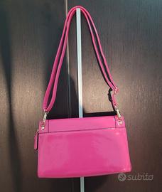 Borsa Armani Jeans in vernice fucsia Elegante e vivace borsa Armani Jeans realizzata in vernice lucida color fucsia, con iconico logo AJ in rilievo sul fronte. Dotata di tracolla regolabile e staccabile, può essere indossata a spalla o a mano, adattandosi a diverse occasioni. Chiusura con patta e bottone magnetico. Interno foderato con tasche organizzate, di cui una con zip, ideale per tenere tutto in ordine. Accessori metallici tono oro. Perfetta per aggiungere un tocco glamour e di colore a qualsiasi outfit. Due lievi imperfezioni (vedi foto) Per misure o altre informazioni contattatemi.