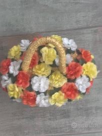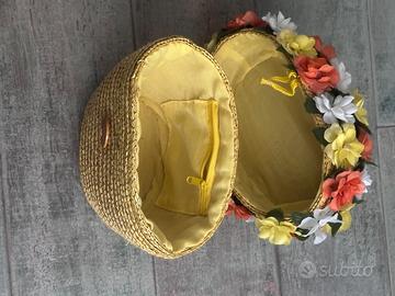 Graziosa borsetta artigianale in paglia gialla a bauletto, decorata con fiorellini colorati.