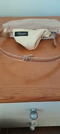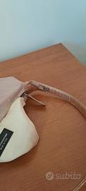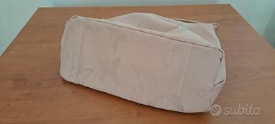 borsetta baguette rosa con disegno farfalle tono su tono. piccoli segni di usura documentati in foto. Misure: larghezza cm 20, altezza 12 cm, profondità 8,5 cm