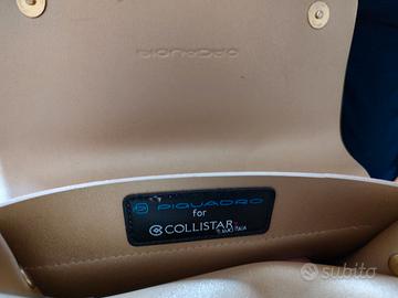 borsetta/beauty Piquadro per Collistar, chiusura con bottoni dorati a pressione, senza cerniere o taschine interne, in similpelle rosa polvere molto delicato e interno dorato.