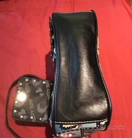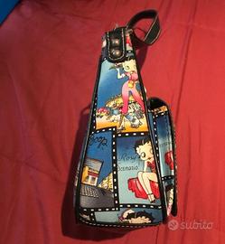 Borsa vintage Betty Boop del 2008 Il tessuto esterno è simile a un materiale di tela, Misura 23cm di larghezza x 17cm di altezza, 2 mini tasche borchiate nella parte anteriore (chiuse con bottone magnetico). Il tessuto esterno ha diverse immagini di Betty Boop, e il tessuto interno ha il suo nome, 1 tasca interna con cerniera e 2 tasche laterali interne.