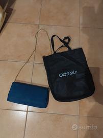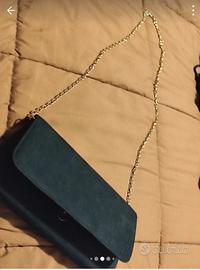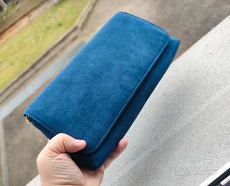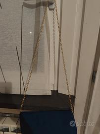 Borsetta elegante in velluto/camoscio blu notte, stile pochette rettangolare, con catena dorata utilizzabile sia a mano che a tracolla.