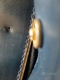 Borsetta blu vintage a 3 scomparti interni più una tasca esterna con chiusura (foto 5) manca un pezzo della chiusura (foto 6). Alcuni puntini sul retro (vedi foto 4). Dimensioni: largh. 30 x alt. 20 cm circa - profondità 14 cm circa.