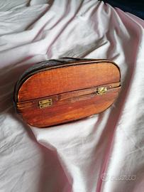 Borsetta artigianale con apertura a conchiglia. È un prodotto molto particolare, il fondo è in legno, i manici in bambù, l’interno in legno, l’esterno ha un rivestimento con disegni molto belli come da foto. La chiusura della borsa è fatta a gancio. Le misure sono 18 cm di altezza e 22 cm di larghezza.