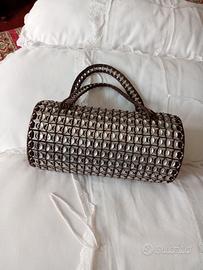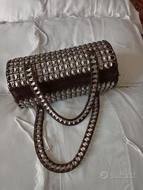 borsa cilindrica a uncinetto in cotone marrone e riciclo linguette lattine, originale e comoda. cm 27 x 13 di diametro