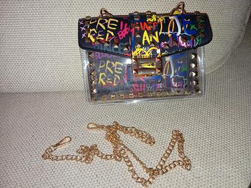 borsetta contenente pochette uguale. sul davanti è trasparente mentre dietro ha lo sfondo nero ricoperto da varie scritte colorate (la pochette invece è tutta colorata con le varie scritte). si può usare anche a tracolla (vedi seconda foto). non è mai stata usata, è nuova senza etichetta.
