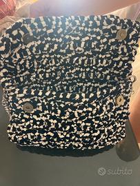 borsetta crochet modelllo chanel in fettuccia bianca e blu con chiusura in clip a calamita e tracolla in accaio . Dimensioni 25x22