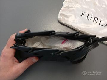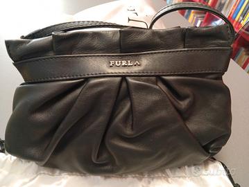 Pochette, borsa mano originale Furla. Pelle nera. In ottime condizioni, usata meno di 5 volte. La bustina in raso bianco è anch'essa originale ma leggermente rovinata.