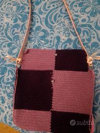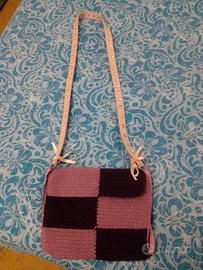 Borsetta realizzata da me ad uncinetto con filo e tracolla glitter. Misure 20×23 cm, tracolla 1 metro, colore rosa antico e bordeaux, chiusura con bottone a pressione ( su richiesta posso aggiungere una cerniera)