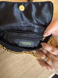 Vendo Borsetta da donna da sera modello "CARPISA", color nero, con ricami floreali, e dotato di una catena a tracollo dorata elegante.