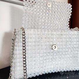 Bellissima borsetta gioiello da cerimonia o da sera di perline bianche trasparenti iridescenti. Dotata di pratico manico in perline staccabile. Foderata con fodera in raso bianco. Ideale per spose o serate. Completa anche di tracolla argentata. Chiusura con bottone magnetico argentato .