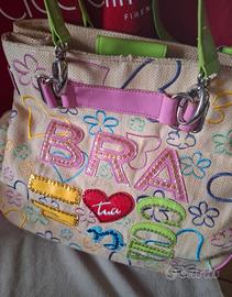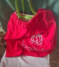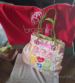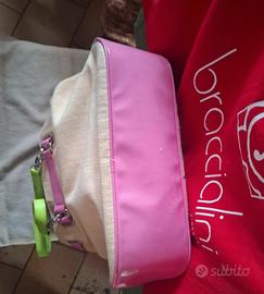 Borza donna in ottima conservazione in poliuretano,poliestere ,manici in vernice e verde con moschettoni davanti in grande logo Braccialini scrite in giallo verde celeste verde ,Tua nel ❤️ rosso (nel fondo beige tipo lino), in alto con delle strisce che chiudono la borza color rosa vernice ,si chiude con cinturina verde clips che chiude gli scomparti nella stoffa rivestimento colore rosa ,capiente x mettere portafogli occhiali, agenda e tante altre cose