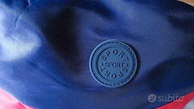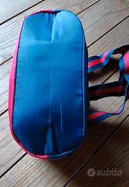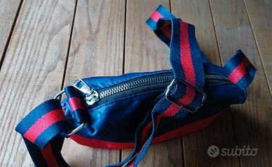 Piccola ma capiente borsa di tessuto impermeabile con lunga e regolabile tracolla.