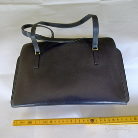 Dotata di 2 manici in pelle eguale a quella della borsetta, larghi 12 mm e lunghi 36 cm ciascuno, che realizzano due U rovesciate alte 15 cm.