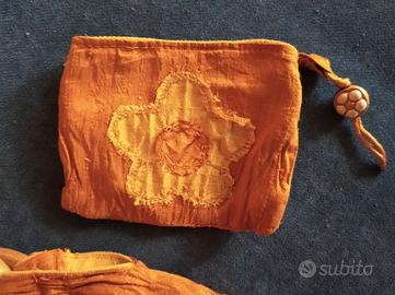 Borsetta in stoffa con manici in bambù, cm.25xcm.20 con tasca interna con cerniera e mini pochette cm.13xcm.10 con chiusura a strappo, colore arancione, interno in cotone,esterno effetto seta,nuova senza etichetta
