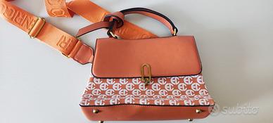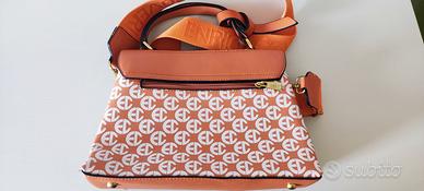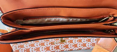 Elegante borsetta Enrico Coveri con un vivace motivo. - Motivo monogramma all-over. - Dettagli color arancio. - Chiusura a girello dorata.