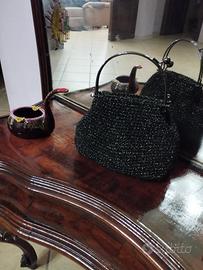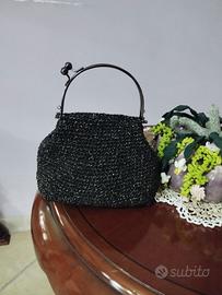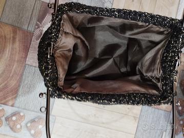 borsetta in corda nera laminata in oro foderata fatta ad uncinetto