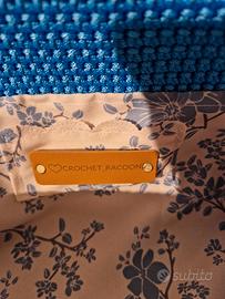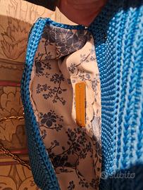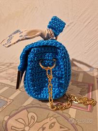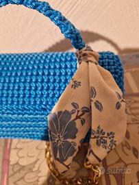 Elegante borsetta realizzata all'uncinetto in un vivace colore azzurro. Presenta dettagli metallici dorati agli angoli e una catena per portarla a tracolla. - Manico intrecciato. - Fiocco decorativo in tessuto con fantasia floreale. - Fodera interna con tasca. - Etichetta sul taschino interno in pelle. - Fatta interamente a mano. - Lunghezza 25cm, altezza 13cm e profondità 8cm.
