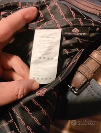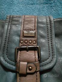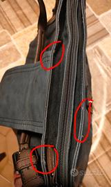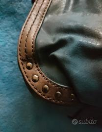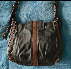 Borsetta Fornarina in similpelle grigia con bordi marroni, mappa con frange a catenella, borchie negli angoli, manico regolabile in lunghezza. Chiusura con cerniera e patta con calamita. Internamente c'è una tasca chiusa con cerniera e due tasche aperte. Mai usata per cui in ottimo stato tranne piccole usure sul bordo superiore, busta in stoffa originale.