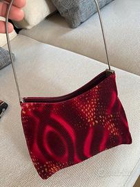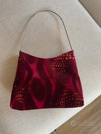 Borsa in velluto a costine color rosso brunito con motivi in oro, manico rigido in acciaio e chiusura interna con zip.