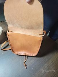 Borsetta artigianale in cuoio, con chiusura a bottone e tracolla regolabile.