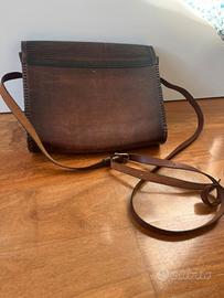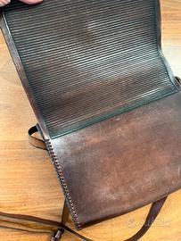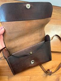 borsetta pezzo unico fatto da artigiano in cuoio. Larghezza cm. 23, altezza cm. 17, profondità cm. 6. Tasca interna chiusa con borchia. Colore marron testa di moro. La patta anteriore è lavorata a costine orizzontali. I bordi sono rotondeggianti e cuciti a mano. Tracolla. Carina e unica