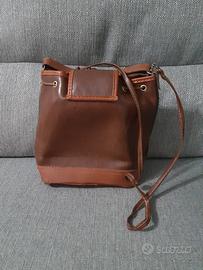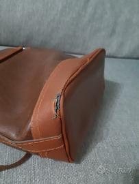Borsa in cuoio vintage, originale anni '80, piccolo secchiello con doppia chiusura (sia tirando i laccetti, sia con la chiusura metallica), possibilità di portarla a mano o a tracolla, anche rimovibile. Tasca esterna sul davanti con zip e tasca interna sempre con zip. In ottime condizioni considerando l'età, da segnalare solo due abrasioni sul retro in basso come si vede da foto.