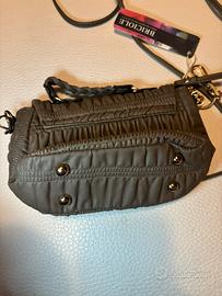 Su richiesta consegna a mano a Bologna - piccola borsa marrone tendente al grigio, con cinghie e chiusura metallica dorate, e moschettone laterale. Misure 19 x 10 cm, adatta per trasportare piccole quantità oppure come idea regalo per bambine, avendo anche il cartellino👛 La tracolla si può sganciare e c’è una maniglia intrecciata per portarla a mano. Sul fondo ci sono quattro borchie che fungono da piedini per appoggiarla a terra senza sporcarla. All’interno è foderata e c’è una taschina con cerniera. in ecopelle morbida e plissettata, molto realistica. Marca Briciole di Sun Qiuli