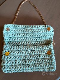 Borsetta in fettuccia verde menta, fatta a mano, con catenella oro e chiusura con bottoni magnetici.