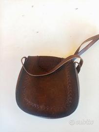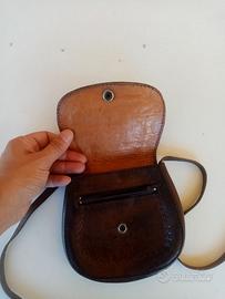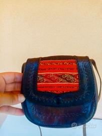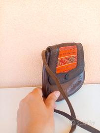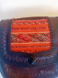 piccola borsa in pelle decorata con particolare in stoffa arancione. con cerniera interna tenuta bene