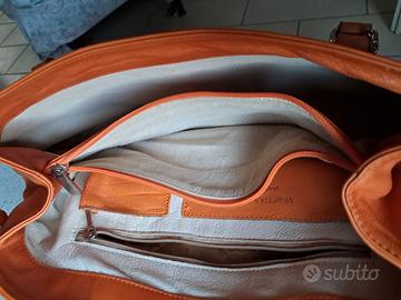 Borsetta color coloniale, marca Venetian Style, madenin Italy; base cm 40 x 18 circa in alto si restringe e misura cm 32 x 12 circa, è alta circa 22 cm, manici belli e non usurati. Difetti: due macchioline chiare nella fodera interna in basso e un piccolo pallino di circa 1 cm chiaro nella pelle sul retro della borsa ( essendo pelle si può passare un lucido in tinta da scarpe e torna perfetta). Chiusure perfette. Numerosi e comodi taschini interni