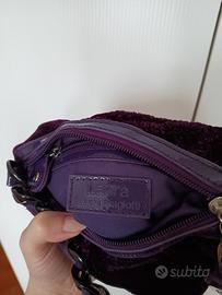 Borsetta pochette in tessuto morbido vellutato, colore viola. Il manico è in materiale rigido effetto vernice, intrecciato.