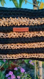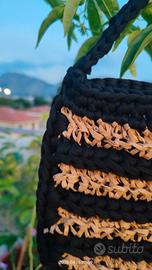 borsetta interamente realizzata a mano all'uncinetto con fettuccia morbida in cotone e rafia naturale,