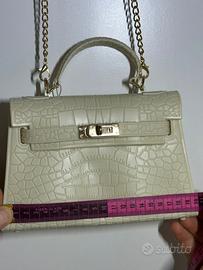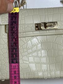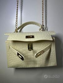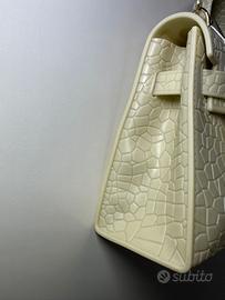 Scopri il fascino raffinato di questa borsa a mano in ecopelle effetto coccodrillo, in una delicata tonalità beije che dona femminilità e classe ad ogni look. La struttura rigida e compatta le conferisce un’allure sofisticata, mentre la chiusura dorata con twist-lock aggiunge un tocco di lusso discreto.