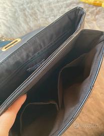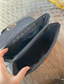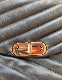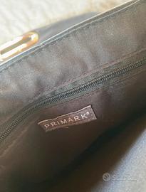 Borsetta nera di Primark con catenina e chiusura in oro, buone condizioni perché molto usata però non presenta danni che ne impediscono l'utilizzo! Catena regolabile in base all'utilizzo: spalla o tracolla. Altezza: 17cm Lunghezza: 25cm