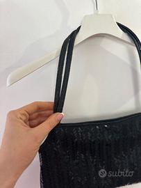 Borsa a spalla nera con una particolare lavorazione a texture con paillettes, disposte a motivo di spina di pesce. La borsa ha la forma a baguette, con manici fissi e sagomatura laterale unica.