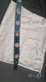 - Charme esterno, maniglia e due tracolle di serie, una nera stretta e una con fiori applicati rosa e beige