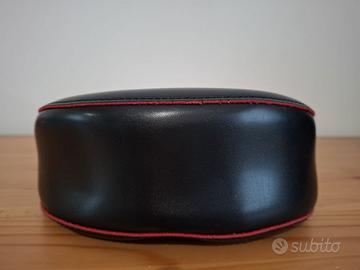 borsetta nera e rossa, forma mezzaluna, con tracolla e tasca interna con zip.