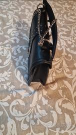 Borsetta semirigida nera con tracolla, una tasca interna con cerniera, in ecopelle con inserti in metallo. Misura 23cm di larghezza, 17cm di altezza e 6cm di profondità al fondo.