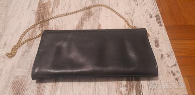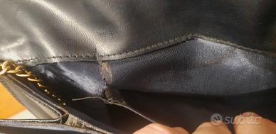 Borsetta in vera pelle con catena dorata. Doppia tasca interna e taschino, il quale presenta una piccola scucitura come da foto. In ottime condizioni, misure 27,5x14,5 cm.
