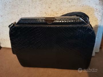 Piccola borsa in vera pelle, chiusura in profilato metallo brunito, 3 tasche interne con e senza zip; modello vintage, utilizzabile anche per costumi cine/teatrali o di carnevale. MIsure in cm: 24 x 18 x 6, manico cm 47.