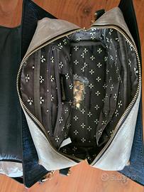 Borsetta NumeroVentidue, colore di base blu scuro con top intercambiabile rivestito decorato con stoffa , logo dorato e tracolla interna.Comparto in tessuto con taschino interno con zip. piccoli segni di usura come da foto.
