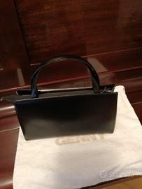 Borsetta originale Genny(made in Italy) in pelle nera e manici corti. Ha la tipica forma geometrica e rigida di questa casa di moda, di linea pulita ed elegante, abbellita dal particolare in acciaio con il logo Genny, all'interno taschina chiusa da cerniera. Dimensioni cm. 27 per 16,spessore della base cm. 8. Adatta ad occasioni eleganti non è una pochette ma una vera borsetta da portare al braccio di dimensioni limitate ma abbastanza capiente. Acquistata negli anni'90 ed usata pochissimo.