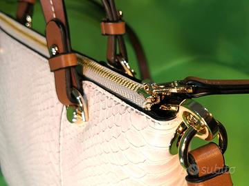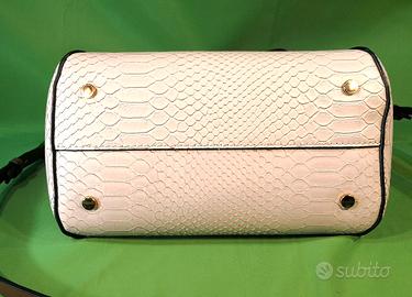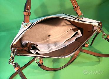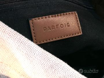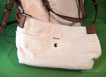 Borsetta marca Parfois semirigida colore panna con manici e tracolla colore tabacco con finiture e fibbie dorate. Forma a trapezio rovesciato dimensioni base cm.23x15x22 in poliuretano inciso, interni in poliestere, chiusura con cerniera per tutta la lunghezza. Tutte le chiusure funzionanti. La borsa non ha tasche interne ma contiene una grande pochette morbida rimuovibile, dimensioni cm.22x10x14 con due tasche esterne con calamita e una interna con cerniera. Borsetta molto simpatica e spaziosa, usata al massimo tre volte, pulita, no macchie trucchi, non fumatrice, si cede per inutilizzo. Preferisco scambio a mano, previa visione, in zona Mestre, Marghera, Mirano-Dolo, Mogliano Veneto, Venezia (P.le Roma) o Comuni limitrofi. Altre foto già disponibili su richiesta direttamente in chat. Tra i miei oggetti disponibili altre borsette stesse condizioni, possibile spedizione multipla. Spedisco velocemente solo con Tutto Subito. In questo caso l'acquirente accetta di acquistare l’articolo come da foto e descrizione. Vendita tra privati nelle condizioni descritte. Se visibile significa ancora disponibile.