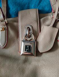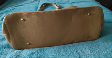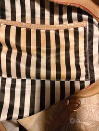 Borsetta in pelle beige e profili rossi, capiente, fodera interna a righe, taschina con cerniera interna, usata ma in buono stato. Manici con piccole usure sul bordo e fodera interna macchiata (vedi foto)