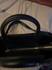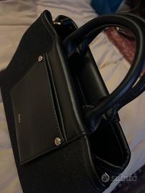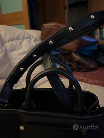 Vendo borsetta di tessuto color nero dí piccole dimensioni con chiusura zip, e tracolla con borchie dorate, piccola tasca esterna.