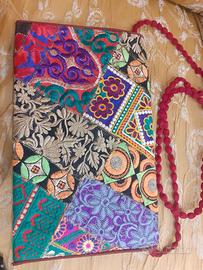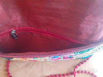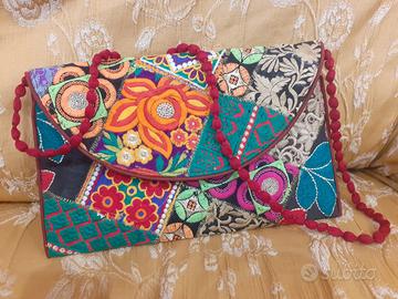 Elegante e pregiata borsetta/pochette ricamata a mano, con motivi floreali e colori brillanti, da mani sapienti. Rifiniture con filo dorato. Morbida al tatto. Taschino interno con cerniera. Fodera interna in raso lucido. Tracolla lavorata in tessuto che permette di essere raccolta o allungata all'occorrenza. Prezzo irrisorio per un prodotto manifatturiero artigianale così ben rifinito.