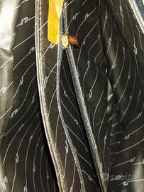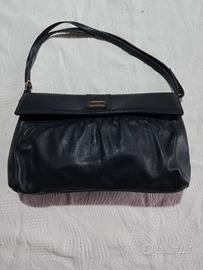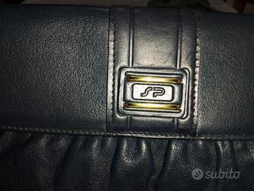 borsa in pelle morbida blu scuro , ben strutturata, con tracolla removibile e dettagli metallici dorati, con interno altresì in pelle decorata, suddivisa in due scomparti più una taschina con cerniera. chiusura automatica sotto il marchio SP made in Italy. ( Esse Pi pelletteria Romana)