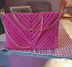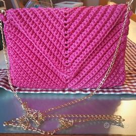 Come da foto vendo pochette borsetta uncinetto interamente fatta a mano con cordino fucsia e rifinita con catenella e chiusura a calamita. Nuova mai indossata