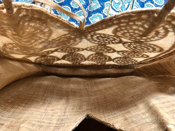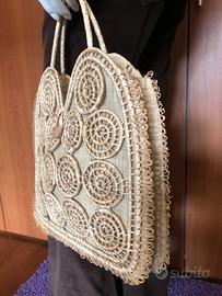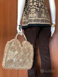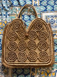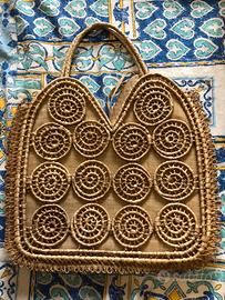 Borsetta quadrata in paglia naturale intrecciata, Boho/Hippie Style con motivi geometrici a spirale su entrambi i lati, chiusura con laccetto e bottone